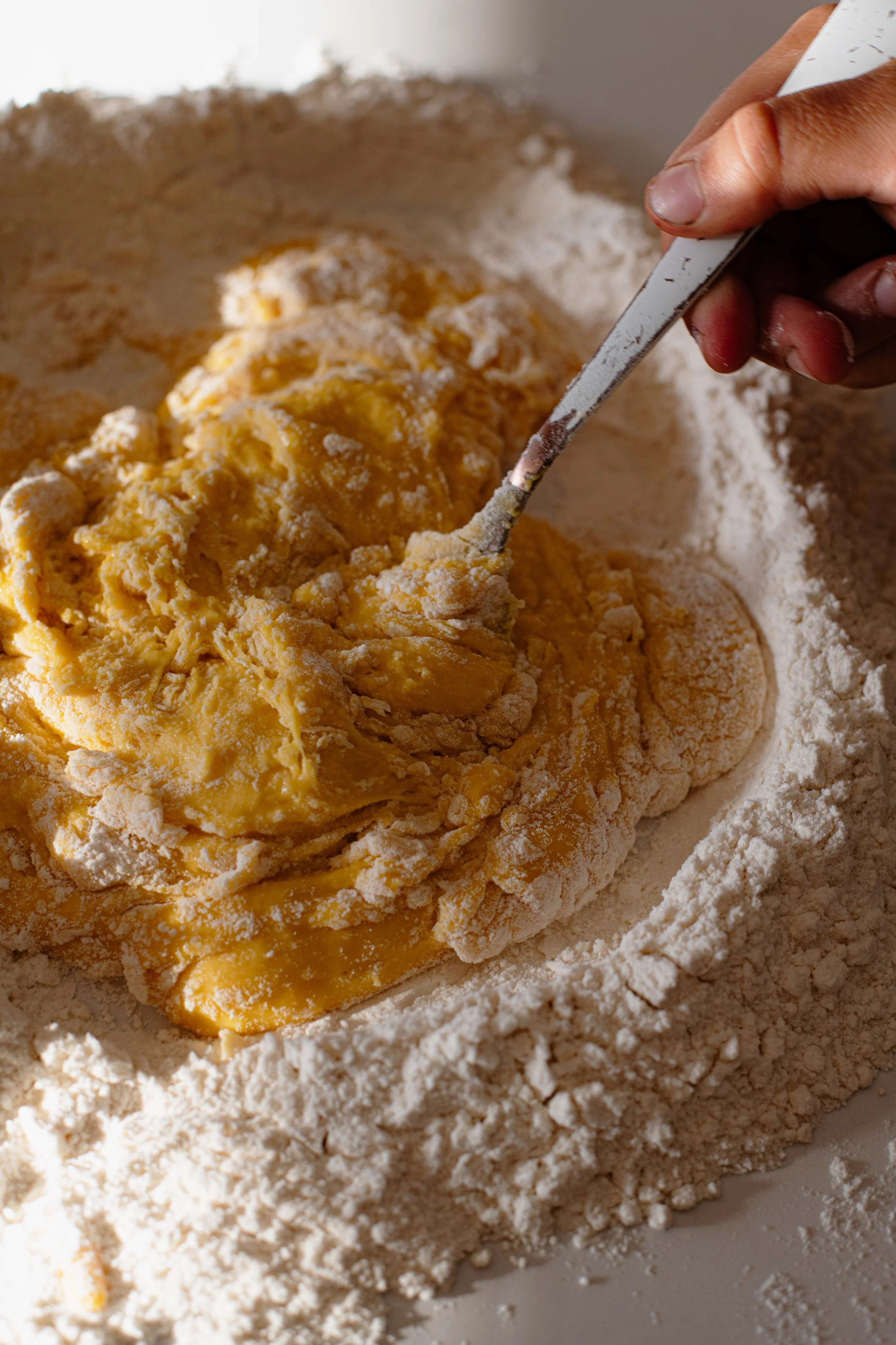 Crack the eggs into the well, add the salt and olive oil, and gently whisk with a fork, slowly bringing in the flour from the edges. It will look a little messy at first, just keep going.
